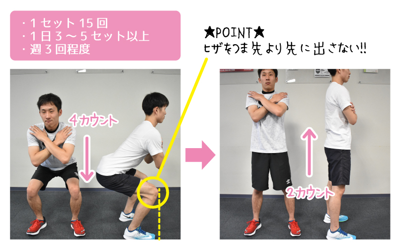 ①足幅を腰幅よりも広めにして立つ。腕は前で交差させる。 |