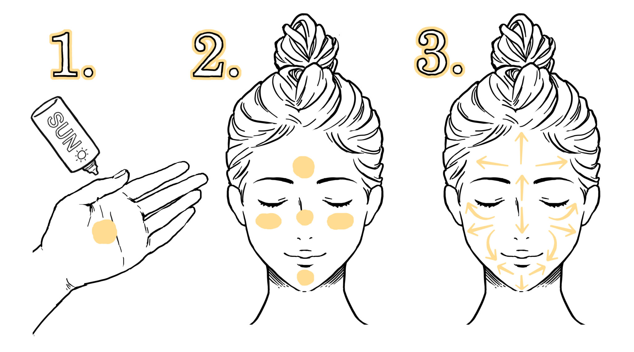 | ①100円玉の量を手の平に取る ②おでこ・鼻・両頬・あごの5点に置く ③矢印の方向に向かって全体にムラなく伸ばす ④最後に両頬に再度重ね塗りをする | |