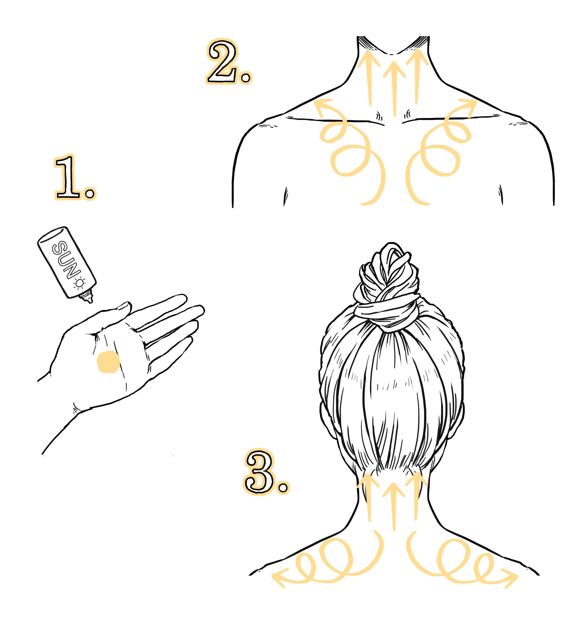 | ①100円玉の量を手の平に取る ②[正面]首は下から上に、デコルテラインは左右にらせん状に塗り込む ③[背面]正面同様に塗り込む ※足りなかったら少しずつ量を増やし、伸ばしていく | |