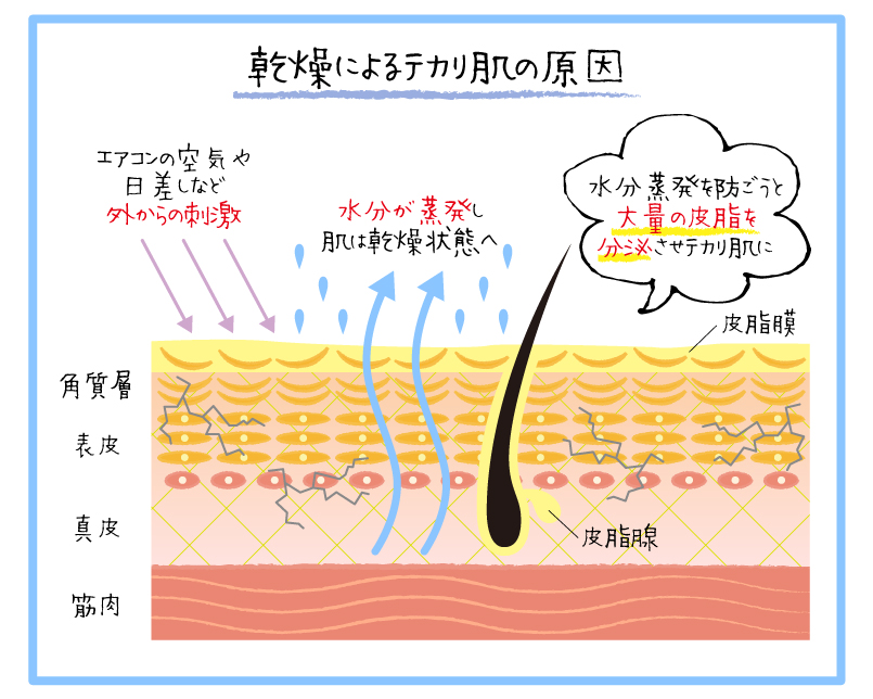 A.乾燥を皮脂が補ってしまい、それがテカリの原因に