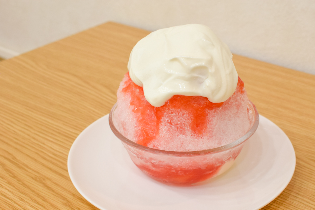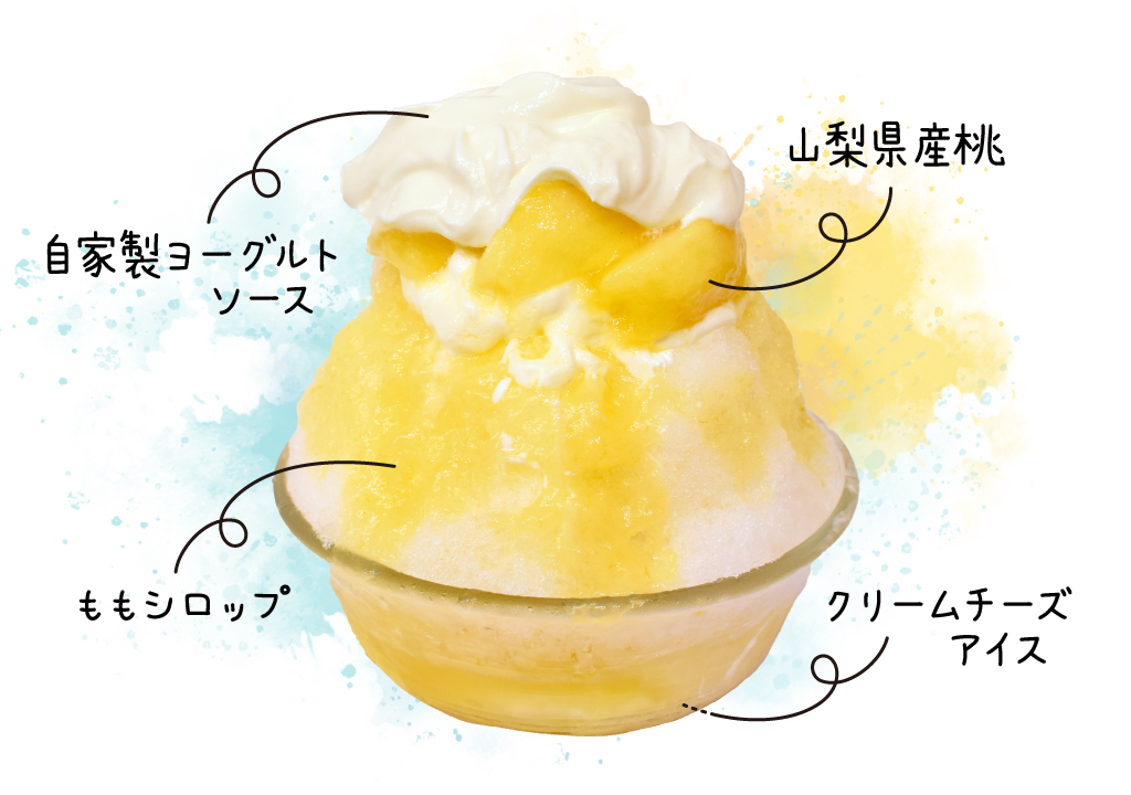 ヨーグルトソースをあしらい、県産の桃が乗った桃づくしの贅沢かき氷。その時々の県産桃を使った手作りの桃のコンポートから作った桃シロップは、甘くて果肉がぎゅっと詰まった味わい。底には、ももアイスとクリームチーズアイスが入っているので、最後のひと口まで飽きずに楽しめる。
