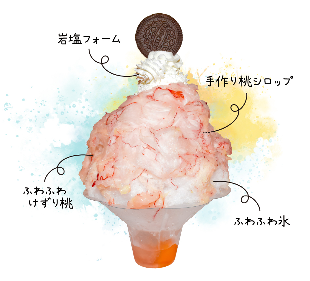 台湾茶房 ホワイトアレイがお届けするこの夏おすすめかき氷は、ふわっふわかき氷の上にふわっふわに仕上げた山梨県産桃をオンしたまさにひんやりスイーツ!氷の中にも手作り桃シロップと練乳が隠れており、ジューシーな桃の美味しさが口いっぱいに広がる。さらにトップにあしらわれた岩塩フォームが程よい塩味アクセントで、桃の甘さを際立たせる。別添えの桃シロップはかけ放題♪もっと桃を食べたい!という欲張りさんも大満足できるはず。