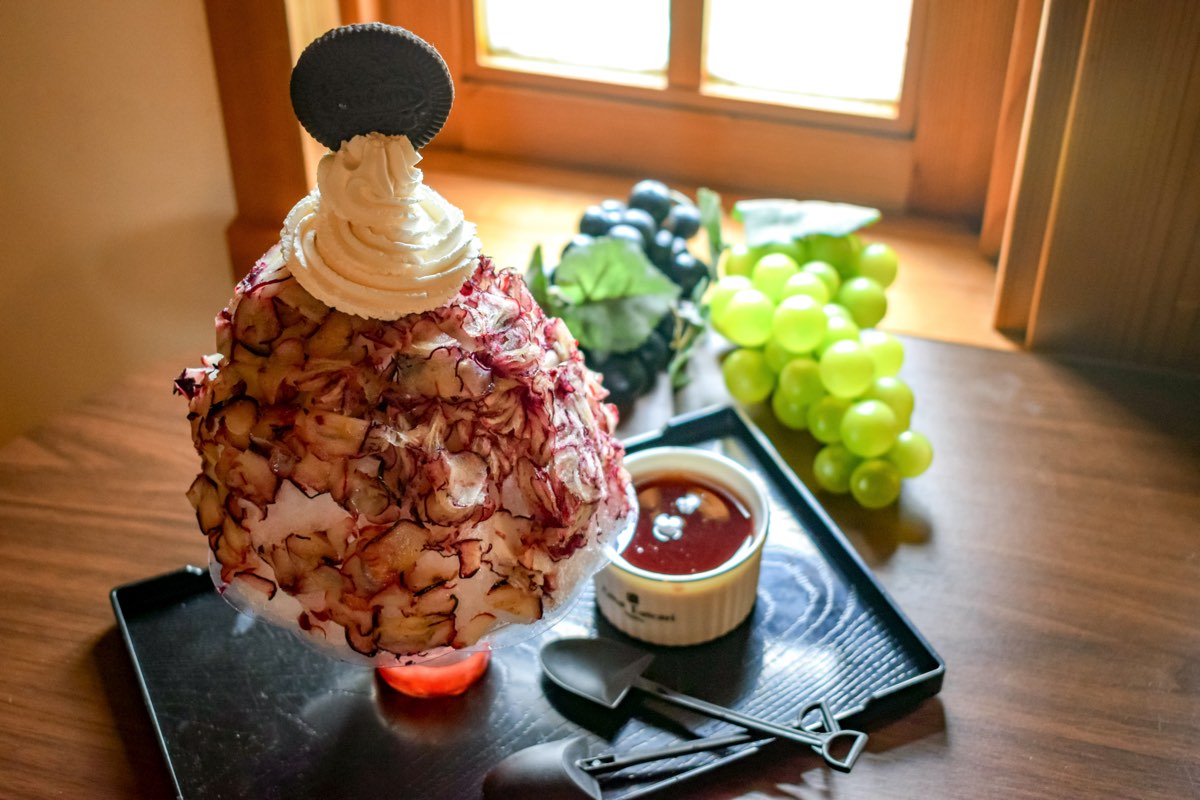 山梨県産巨峰を贅沢に使用した色鮮やかな紫が目を引くふわふわ雪花氷 巨峰。こちらもふわっふわ氷の上にふわっふわに仕上げた巨峰をあしらい、まるで巨峰を丸ごと食べているかのような味わい。こちらも巨峰シロップがかけ放題なので、思う存分ひんやり美味しい巨峰を味わいつくそう。