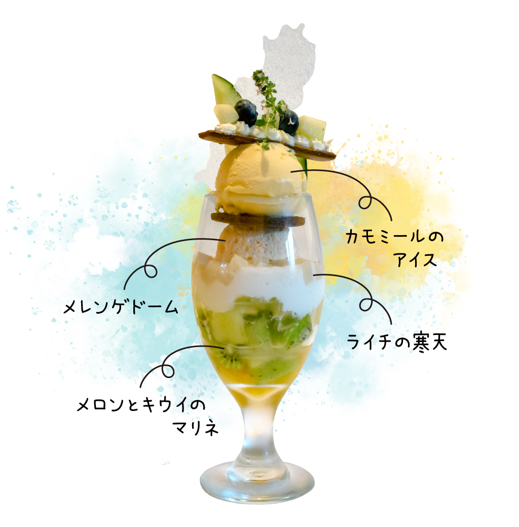 Café Karfaがお届けする夏のパフェは、山形県産庄内メロンを使ったメロンパフェ!メロンとブルーベリーをあしらったパートサブレの下にはカモミールの香り爽やかなアイスクリームがサクサクのメレンゲ・なめらかな杏仁クリームと絡み合う。食べ進めるとライチの寒天がしゃっきりとした食感のアクセントを与え、メロンとキウイのマリネが顔をのぞかせる。マリネにしのばせた黒胡椒が相性抜群で、ジューシーなマーマレードと一緒に食べれば、口の中いっぱいにメロンの美味しさが広がる。どこを食べても美味しく、見た目麗しいメロンの味わいが凝縮したメロンパフェ。この夏絶対食べておきたい一品だ。