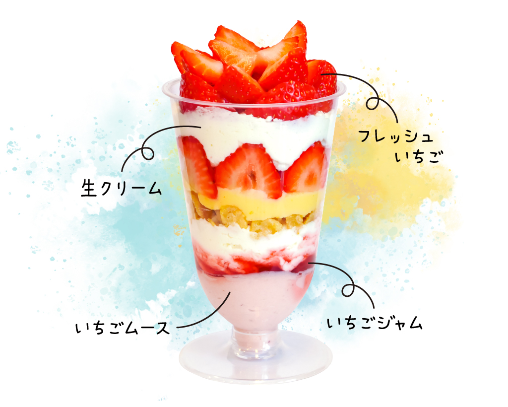 いちごの果実をふんだんに使った「もりもりイチゴパフェ」。もりもり入ったフレッシュいちごと全て手づくりのいちごジャムといちごのムースはまるで果実の様な味わい。人気のクレープでも使用している生クリームとカスタードクリームがまた絶妙!食べ応えのあるこの一品は、銀の糸でこの夏新たな定番になること間違いなし!!