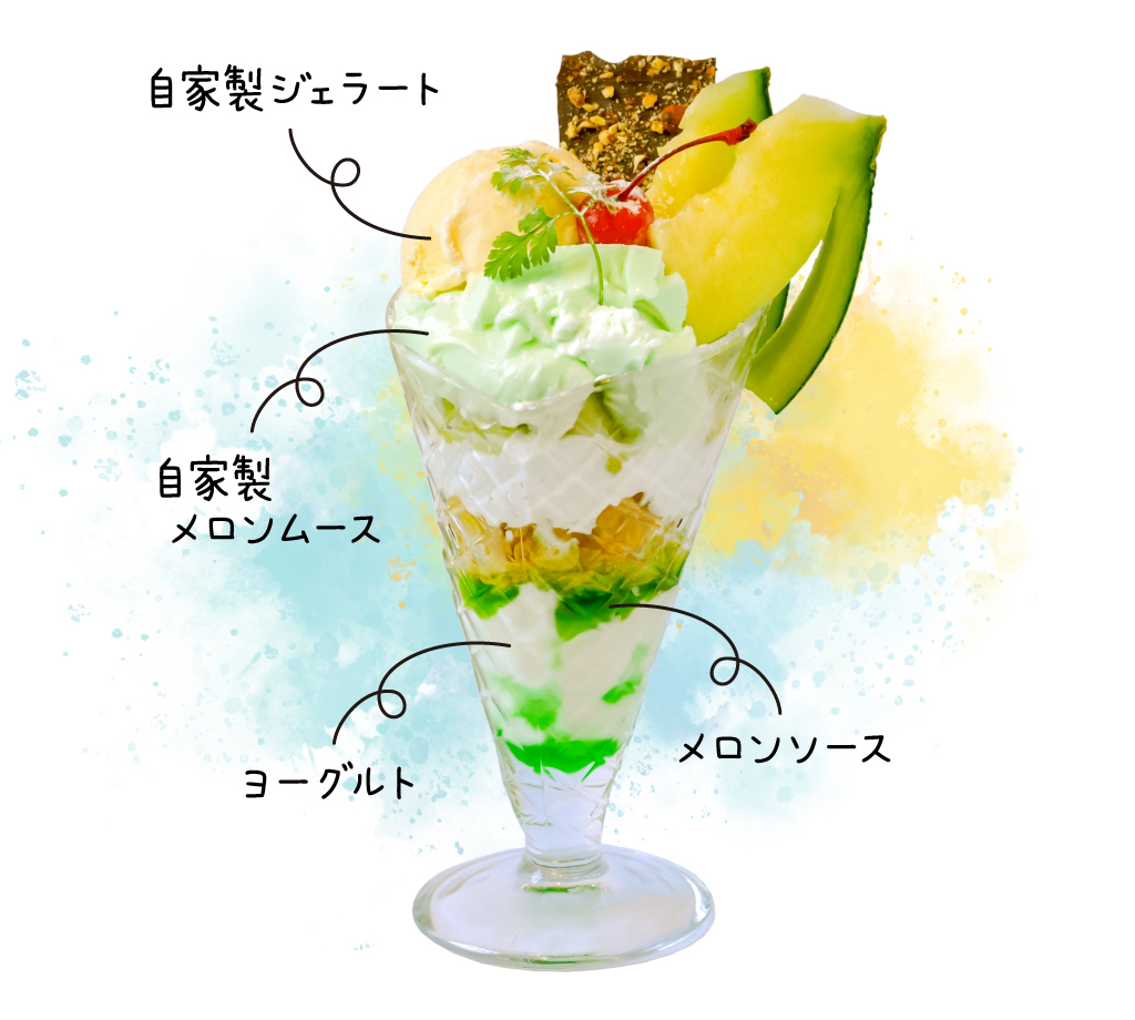 見た目も爽やかなL.D.Kの「The メロンパフェ」。自家製手作りのバニラジェラートとふわふわのメロンムース、甘すぎず絶妙な味わいと滑らかさに驚く!またこちらも自家製のアーモンドチョコが良いアクセントに。食べ進むとカットメロンがゴロゴロと入っているのに2度驚く。ヨーグルトとメロンシロップで最後はさっぱりとメロンを満喫できる一品。