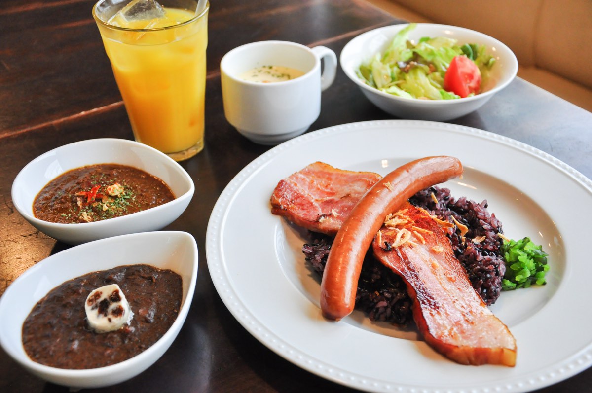 L.D.K人気のオリジナルキーマカレーと清里ビーフカレーを同時に味わえる欲張りな一品。カレーはどちらも深い味わいで、写真の黒米ブレンドは健康にも配慮。他にも白米とパンも選べるのが嬉しい♪更に欲張りなあなたにはトッピングでソーセージと厚切りベーコンがおススメ。