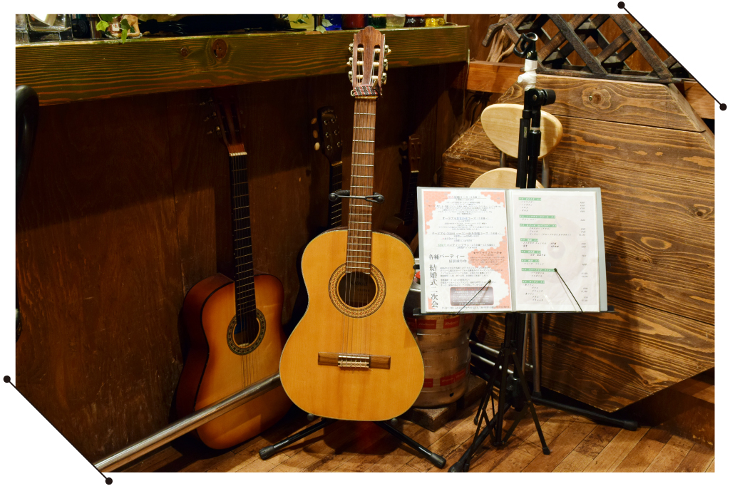 | Zildzianとはシンバルのメーカー。店内にはオブジェとして様々なシンバルが飾られている。 他にギターも置いてあり、自由に演奏可能!気持ちを込めた演奏で、みんなに喜ばれるサプライズを♪ | ![]() |