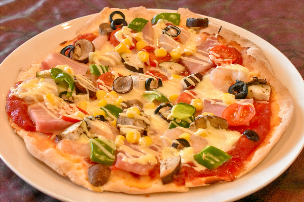 生地から手作りしたサクサクのクリスピーなピザは、おやつ感覚で食べられ、お酒のおつまみにも相性抜群!どこを食べてもぎっしり具材がのり、バラエティ豊かな味が楽しめる。特にベーコン、エビ、たまねぎ、オリーブ、きのこ、ピーマン、コーン、トマトと具だくさんのミックスピザは大人から子どもまで大好きなメニュー。
