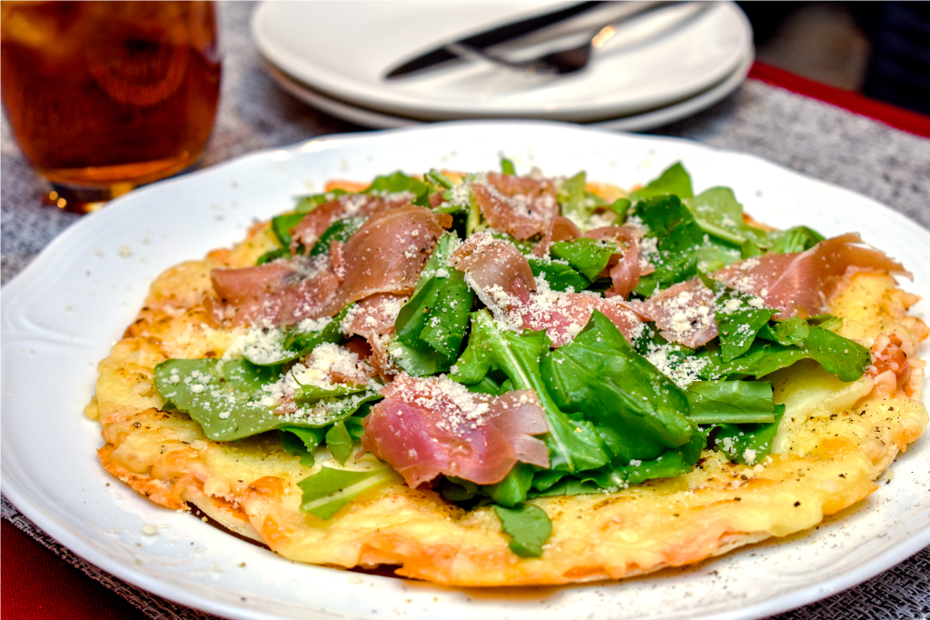 店内のピザ生地はすべて、ミラノ風クリスピー。中でも人気爆発中の、「生ハムとルッコラのピザ」は、モッツァレラやシュレッドチーズなど、濃厚なチーズが生地の端までとろ~り。厳選した生ハムと、新鮮なルッコラがたっぷりの贅沢な一枚。塩味の効いた食材がワインとの相性もバツグン。