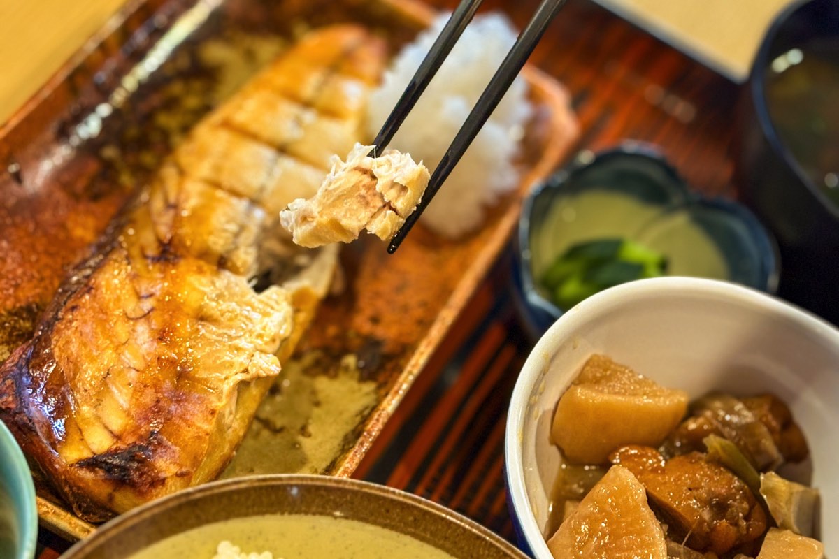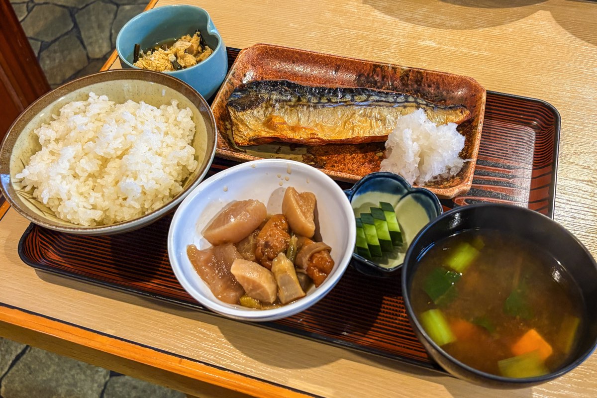 取材日のメインは「サバの塩焼き」!ビッグサイズなのに皮目はパリッと、中はふっくらジューシー、程よい脂と塩味でご飯が進む~。自家製味噌を使った味噌汁や看板の刺身こんにゃく入りの副菜など、手間暇を惜しまずに作る様々な料理で、最後まで飽きずに食べられちゃう。