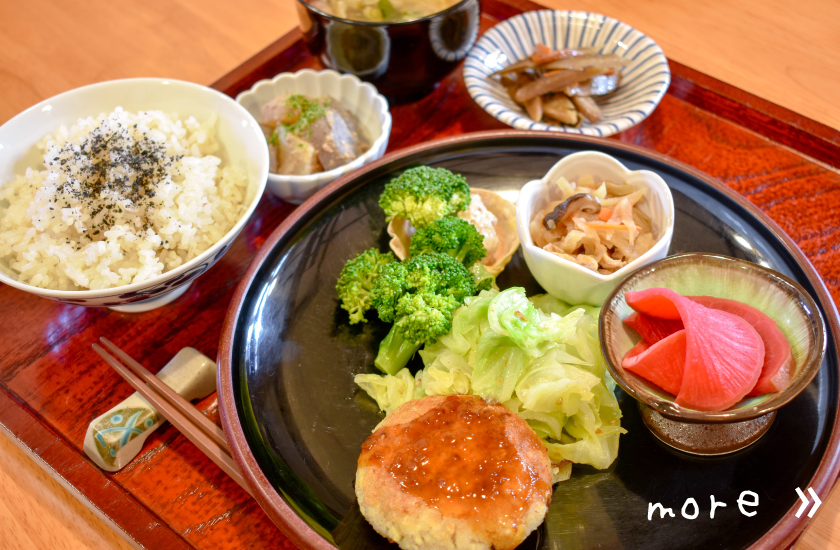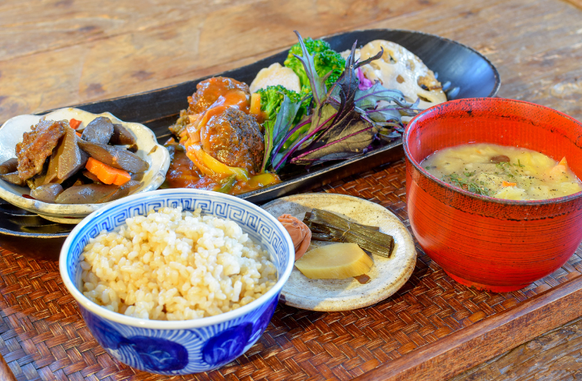 玄米、全粒粉を主食に、豆や海草、塩から組み立てた玄米菜食。肉、卵、乳製品を基本的に使用せず「一物全体」「身土不二」「陰陽調和」の三大理念に基づく食事法。