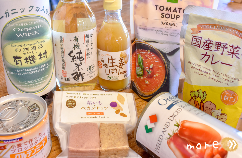 「有機」という意味で、化学肥料や農薬に頼らずに、できる限り自然の力で育て、認定を受けた農産物のこと。野菜だけに限らず、有機飼料で育てたオーガニックポークなどもあり。