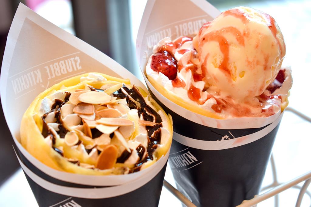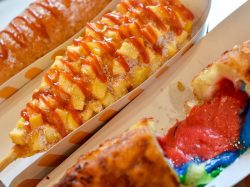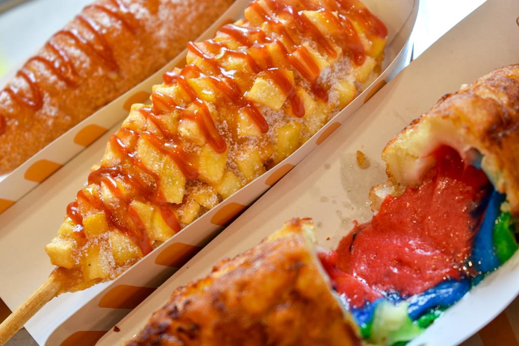 独自調合で作るクレープは、生地だけでも絶品もちもち食感!米粉を使用した軽い食感のチーズハットグは女性でもペロリ。食べてびっくり!レインボーチーズハットグもぜひ。
