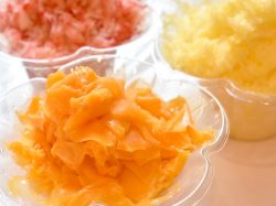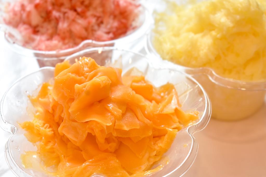 県産苺、桃を丸ごと削る贅沢なけずりフルーツもおすすめ♪マンゴー・パイン・みかん等珍しいものも♪無料トッピングもあるので、お好みに合わせて注文を!