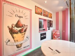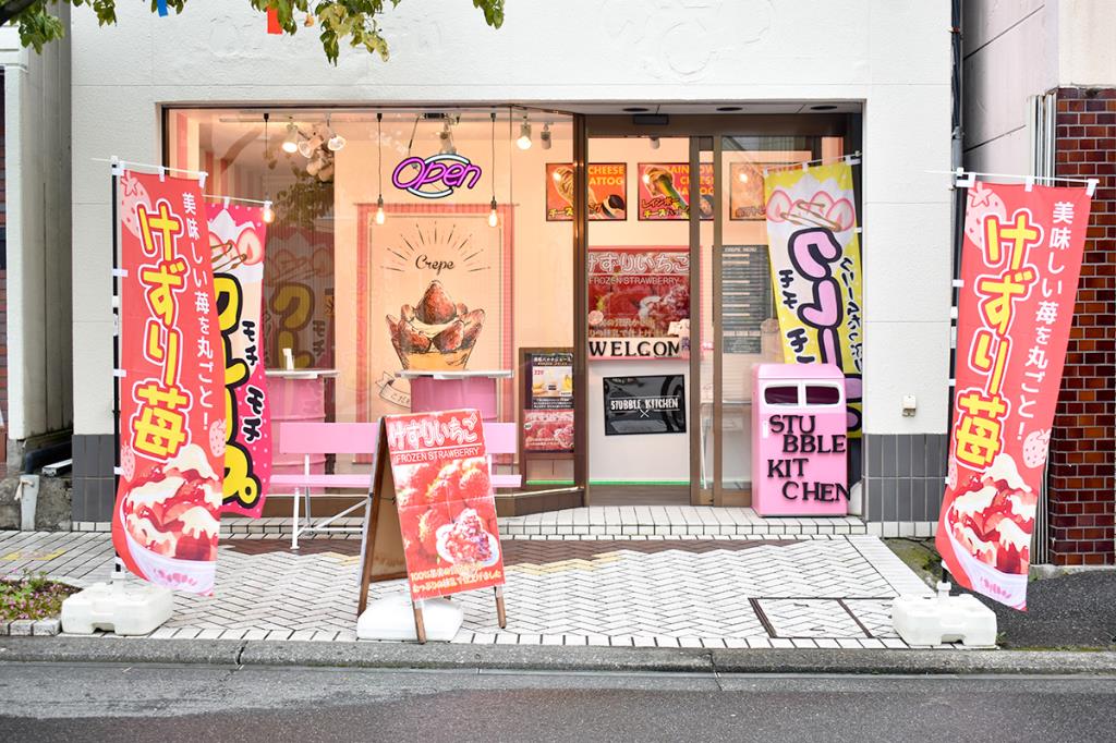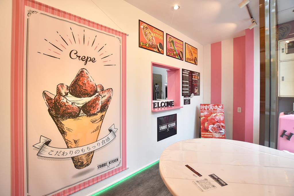 朝日通り入り口に店舗を構えるSTUBBLE KITCHEN。DIYの店内は、ピンクと白がベース♪