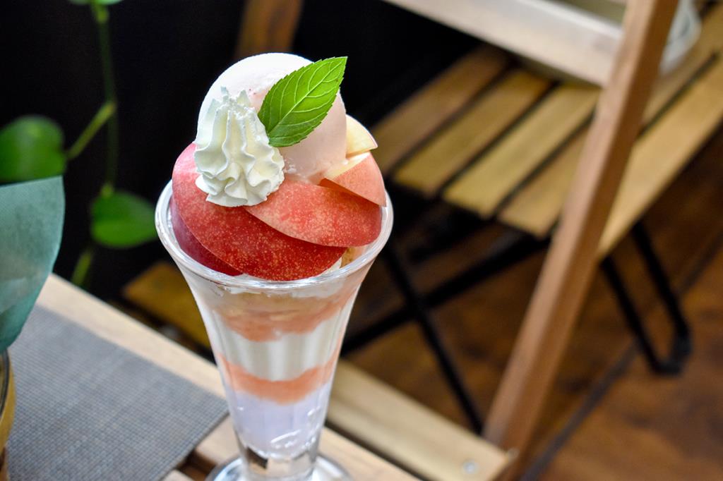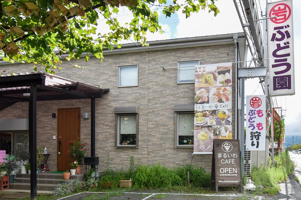 蛍見橋から車でおよそ1分のまるいわ農園に併設された「まるいわCafé」。果実の郷、笛吹市で栽培した桃とぶどうのスイーツはお店自慢の味。