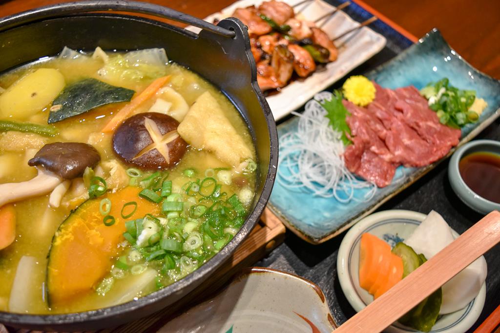 なんといっても1番人気は「ほうとうセット」。馬刺し・焼き鳥がついており、山梨を味わえるお得なセットだ。