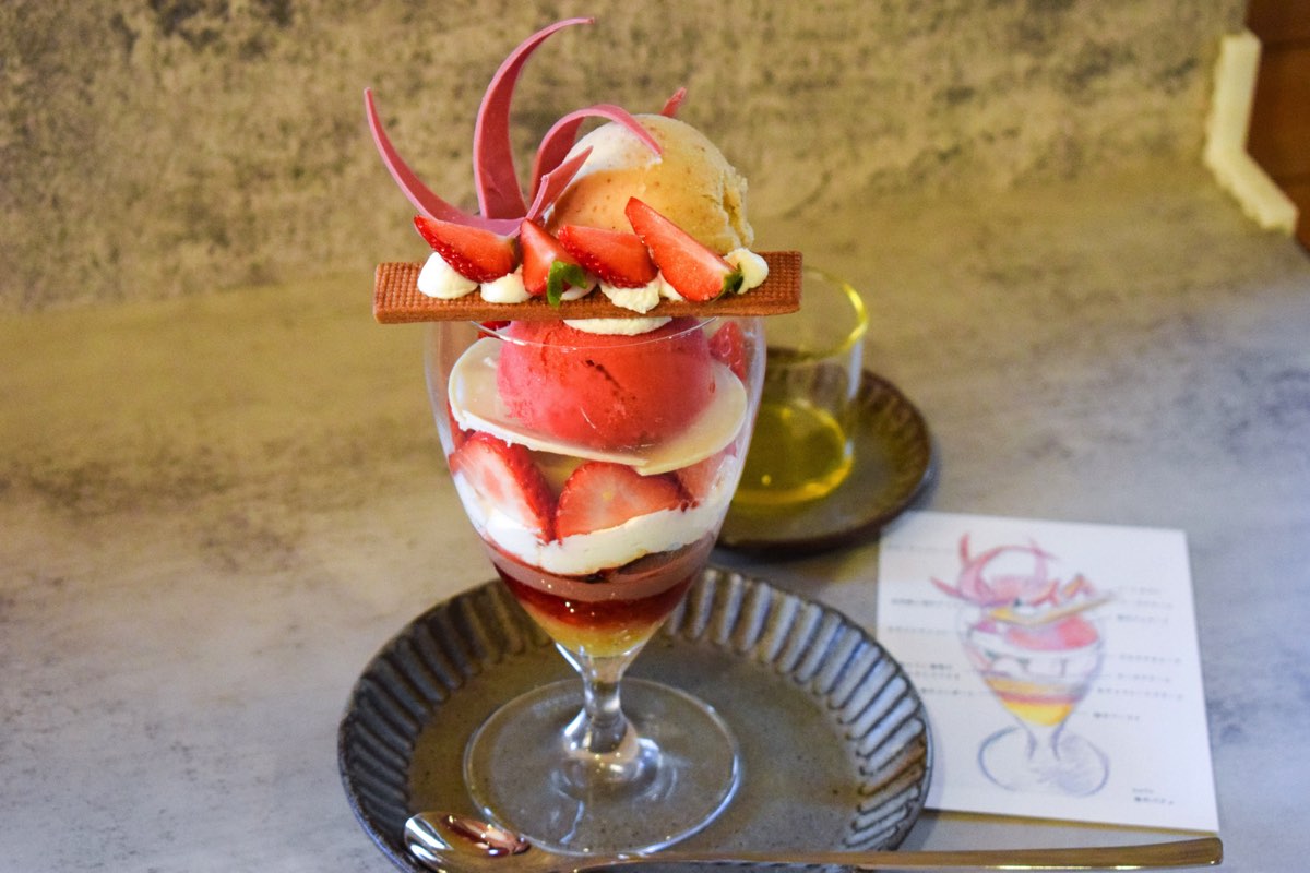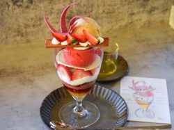 コース料理のようなストーリーのあるパフェは、香り高い苺アイスとクリーミーな白味噌アイスを…