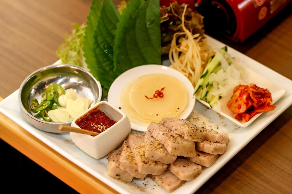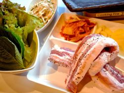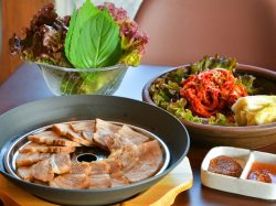 サムギョプサルを頂きました。店員さんが目の前でお肉をカットしてくれます。エゴマの葉と一緒に食べると更に美味。店内はK-p...