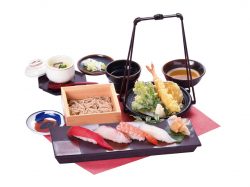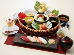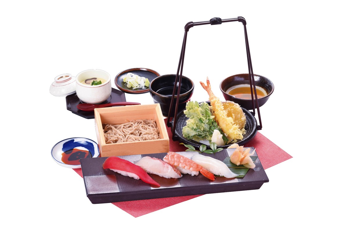 天麩羅・寿司・そばの他、様々な小鉢と組合わせた御膳や籠料理が自慢。