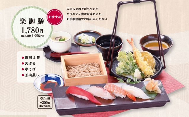 天ぷらやおそばもついてバラエティ豊かな味わいをお手頃価格でお楽しみください。