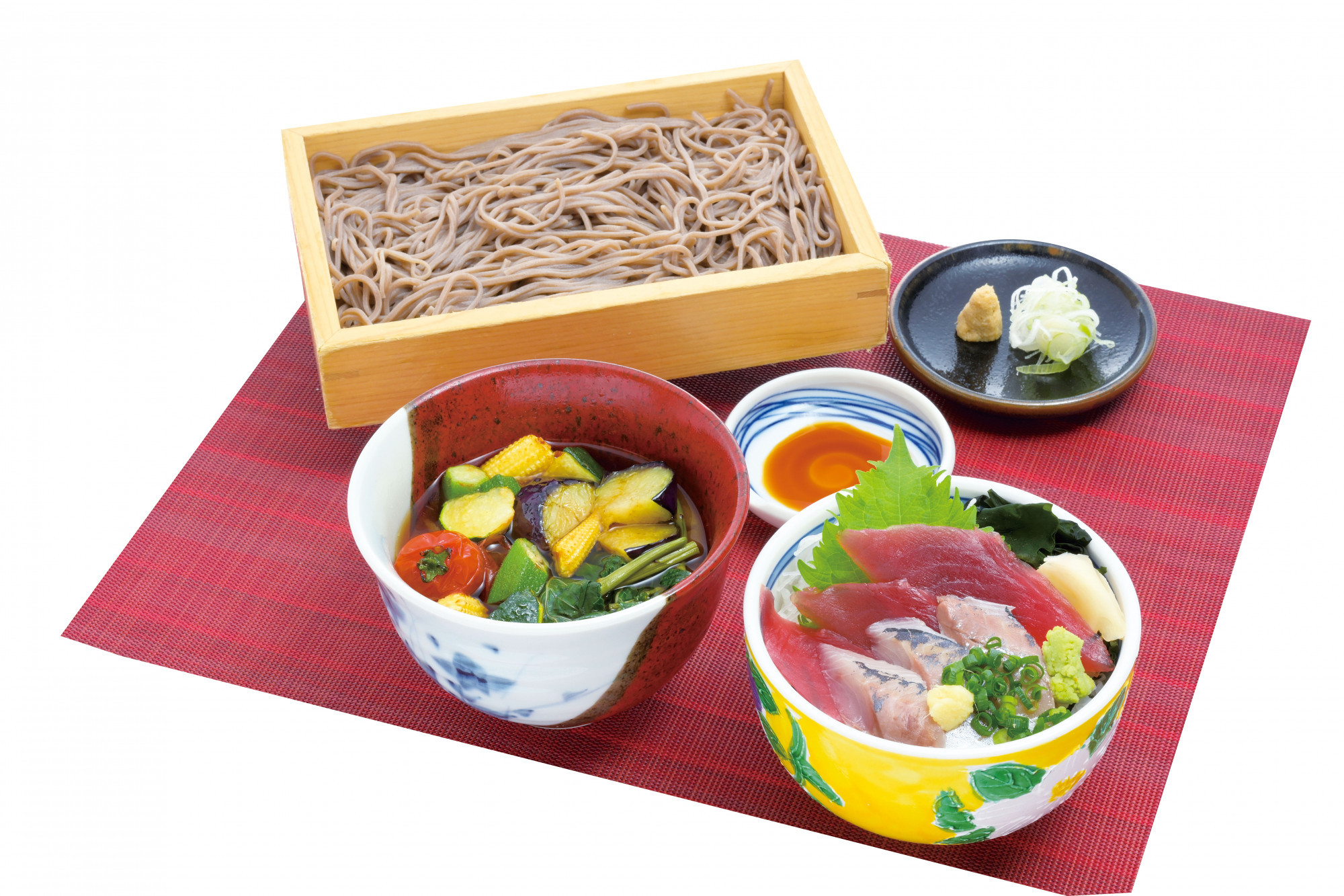 新鮮お刺身の海鮮丼と旬の夏野菜がたっぷり入ったそばセット