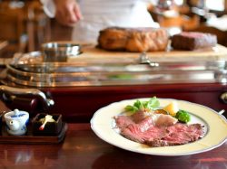 約30年愛され続けるローストビーフは、これ目当てに県内外から多くのファンが訪れる。塩やわさび醤油が添えられ、まさに舌がとろける味わい。目の前でサーブしてくれるパフォーマンス付きで特別感も◎
