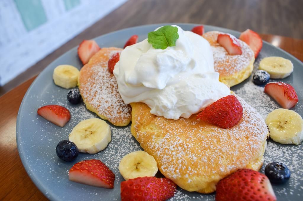 またふわふわ食感のパンケーキを3枚といちごやバナナ等のフルーツが散りばめられた贅沢な「フルーツパンケーキ」はココだけで食べられる贅沢な一品。