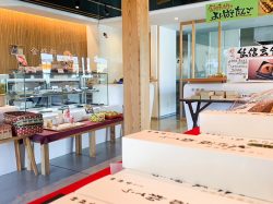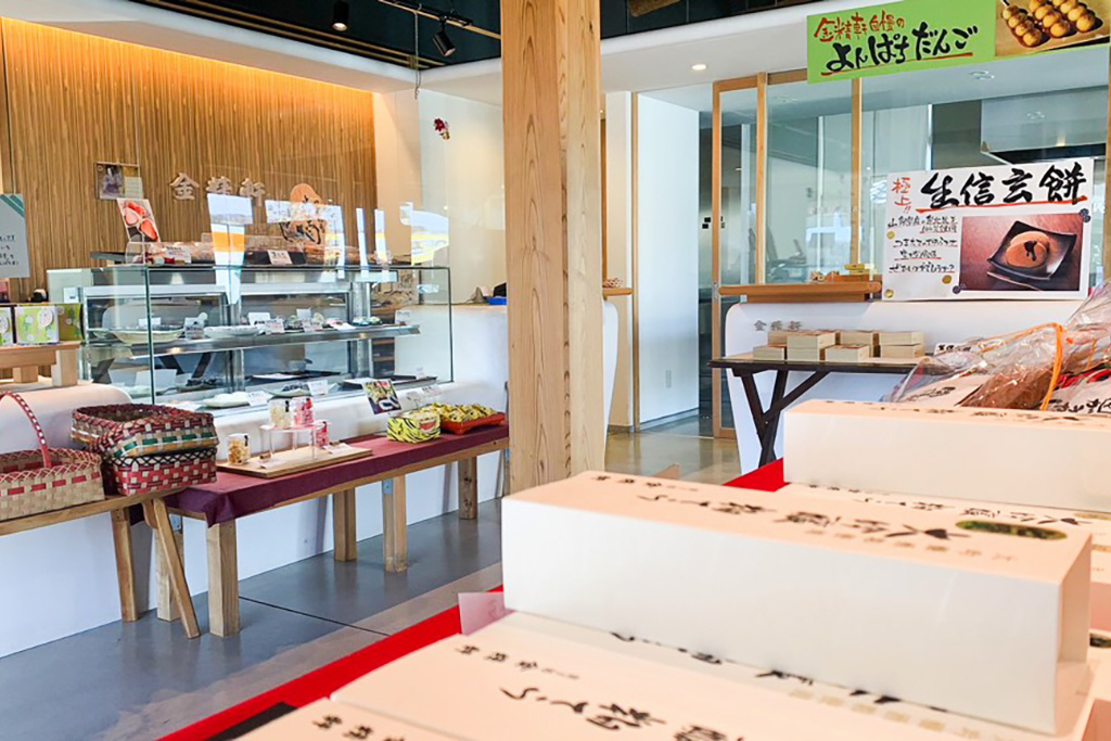 焼きあがるお餅をイメージしたユニークかつお洒落な店内には、信玄餅をはじめとした美味しい和菓子が並ぶ。