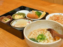 麺は国産小麦を使ったモッチリとコシが強め、つるつるの喉越しがクセになる。出汁は良質の煮干しと鰹やサバの厚削りを使ったさっぱり醤油と味噌の合わせつゆ。ベーシックなうどんはモチロン、「キムチうどん」のようなオリジナルメニューも取り揃える。