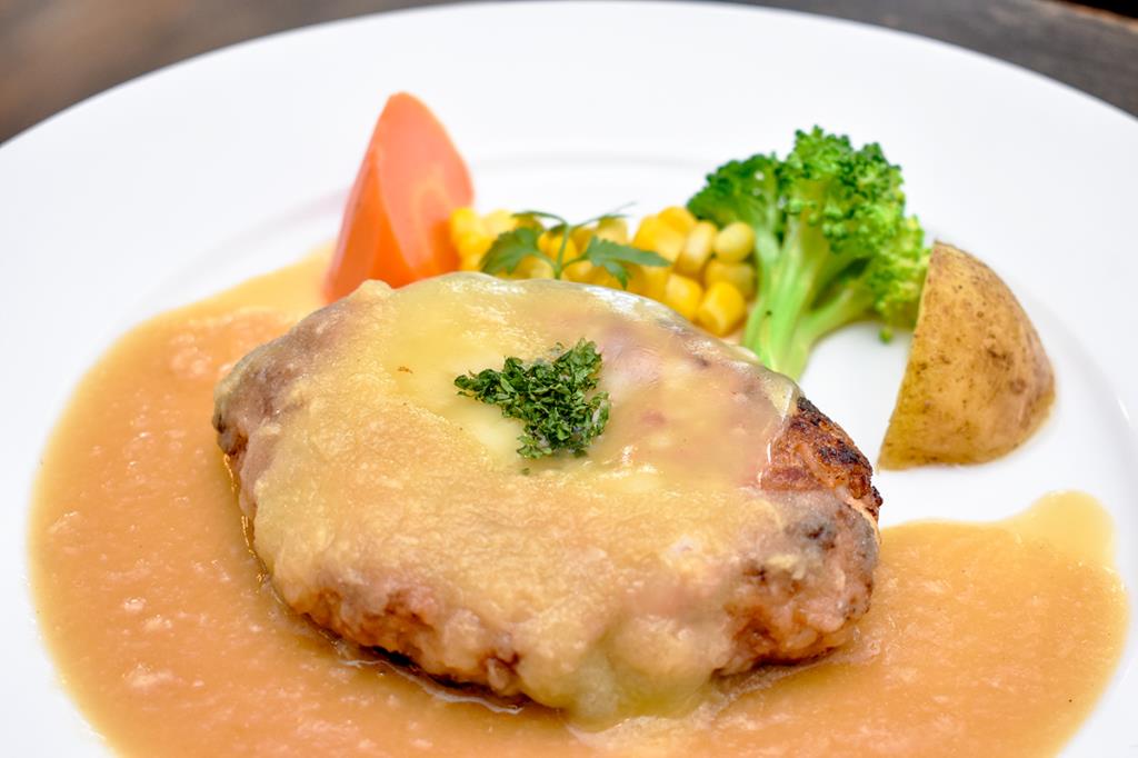 名物のれんがハンバーグは手ごねハンバーグの上にチェダーチーズ、マヨネーズ、生ハム、フライドオニオンがトッピングされたボリューム満点のメニュー。なんと中にもチーズが隠れているので複雑な味を楽しめる。