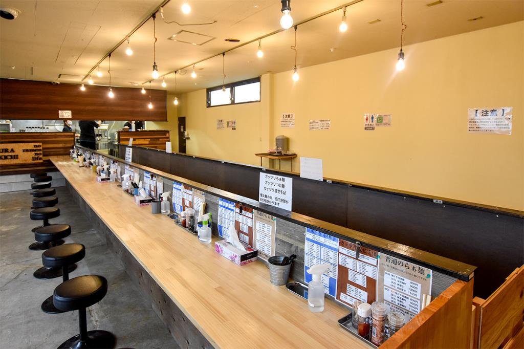 横濱家系 雷家甲府市酒折にあるラーメン店「雷家」。明るく清潔感のある店内にはカウンター、テーブルがありシーンにも合...