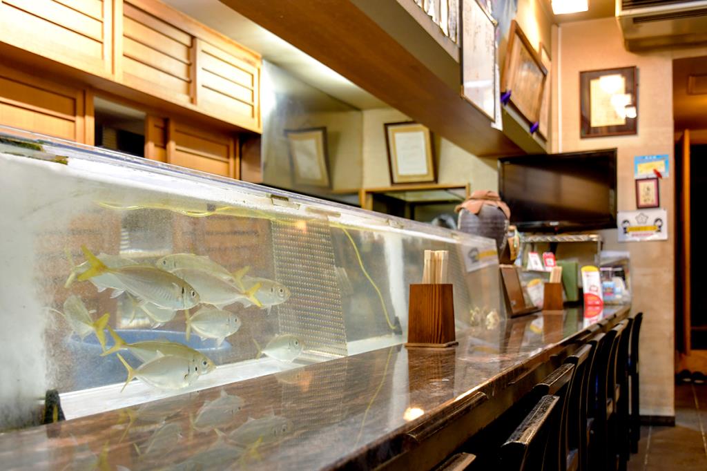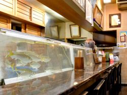 暖簾をくぐれば小粋なカウンターと、目の前には活魚が泳ぐ水槽が印象的。店の自慢はモチロン活魚。沼津産の鰺や鉄火丼の秘伝タレ、ヒラメの薄造りなど新鮮でないと食すことが出来ない素材そのもを楽しめる。