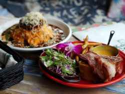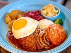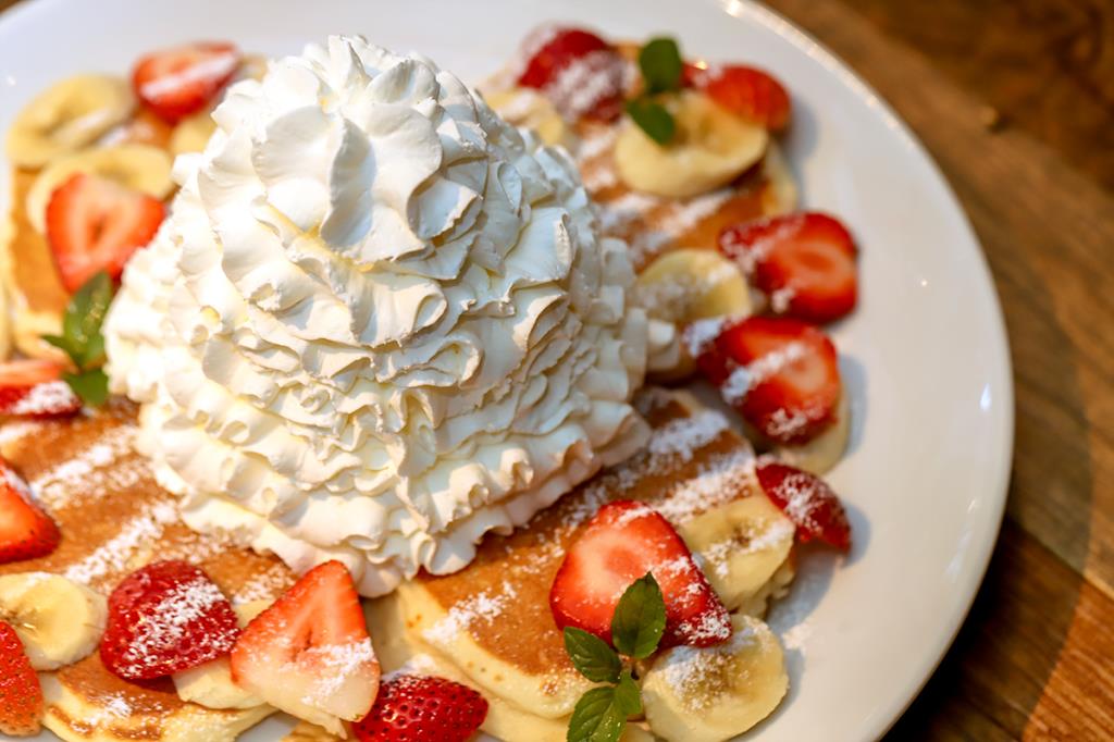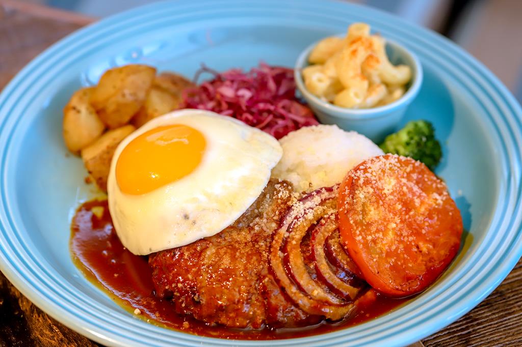 生地から作るふわふわのパンケーキは、ここに来たらぜひ食べてほしい一品♪お子様からお年寄りまで食べやすくアレンジしたハワイのローカルフード・アヒポキライスやジューシーなハンバーグロコモコなどフードも充実!