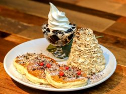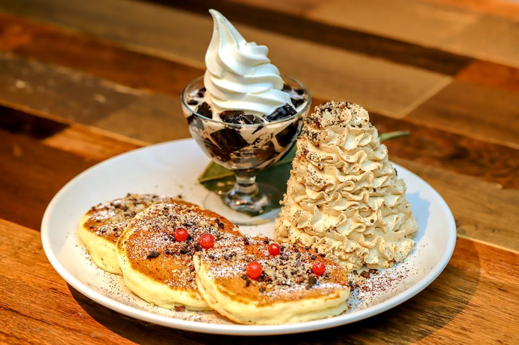 期間限定のチョコレートモンブランパンケーキを食べに行きました。マロンクリームやココナッツアイス、ホイップクリームがとって...
