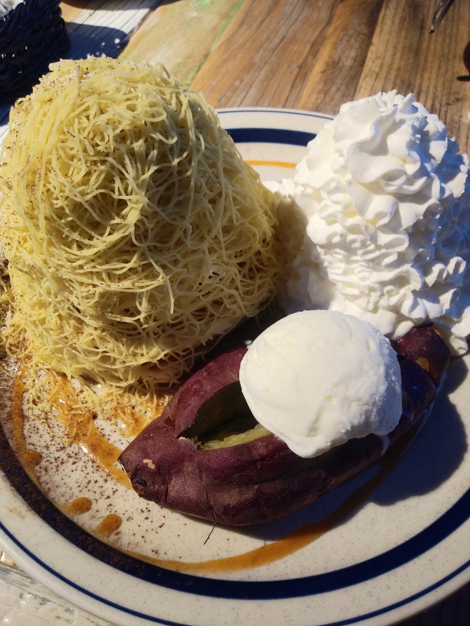 今月しか食べられない「スイートウアラパンケーキ」。焼き芋の上にはココナッツアイスがのっています。パンケーキの上にはモンブランクリーム、中にはチョコレートや マロンアイスが入っていました。生クリームも相変わらず美味しくて満足です。何より、焼き芋が美味し過ぎてびっくりしました。糖度高めの、ねっとり系焼き芋。今まで食べた焼き芋の中で1番美味しいと思いました。皮ごと食べても気にならないです。もう1回食べに行きたいです。