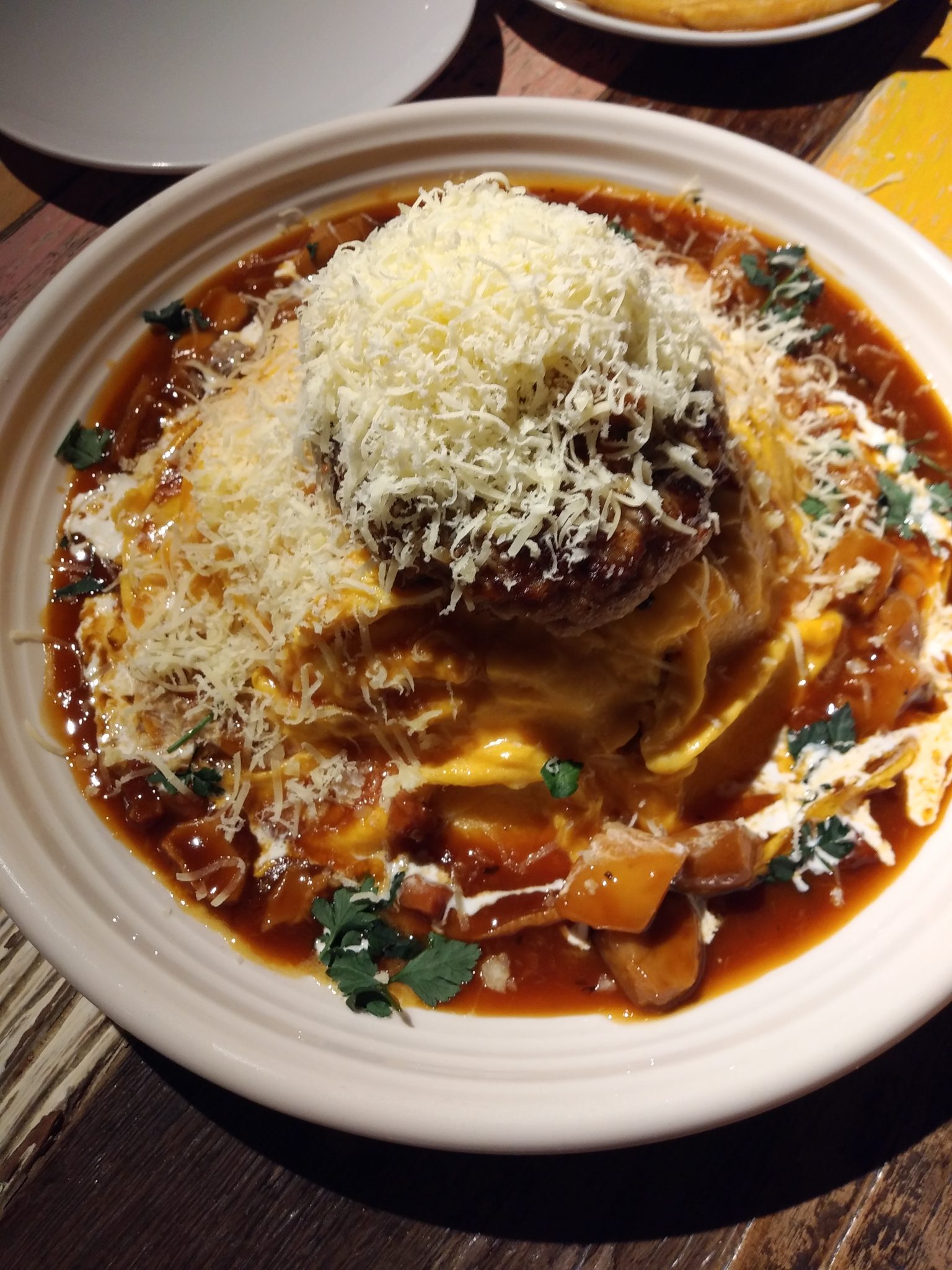 12月15日~1月25日までの限定メニュー「オムレツロコモコポルチーニ」を頂きました。メニュー名はオムレツとなっていますが、中にはご飯が入っていたのでオムライスでした。スタッフさんが仕上げに目の前でパルメザンチーズをたっぷりかけてくれました。ポルチーニ茸のだしが効いて、あっさり味でした。イメージと違い和風な味で美味しく頂きました。