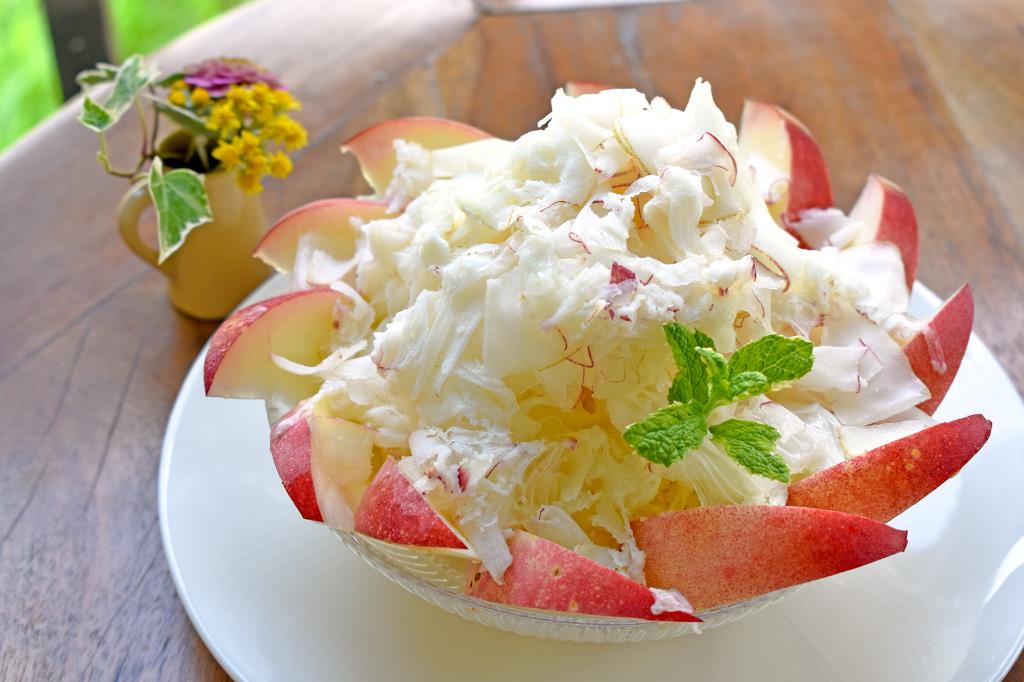 豆乳べースのソイバニラアイスクリームと凍らせた桃を皮ごと削った、優しいピンクのふわふわか…