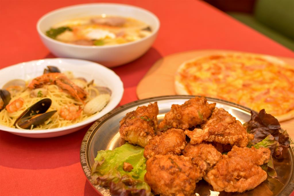 ・五目そば 860円 ・菊翠オリジナルとりの骨付きから揚げ 1,600円 ・パプリカ、オニオン、ベーコン、オレガノのピッツア(24㎝)1,500円 ・魚介のオーリオパスタ(塩味)1,700円 ※すべて税別 |