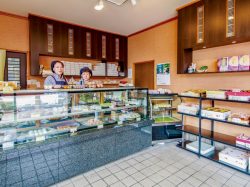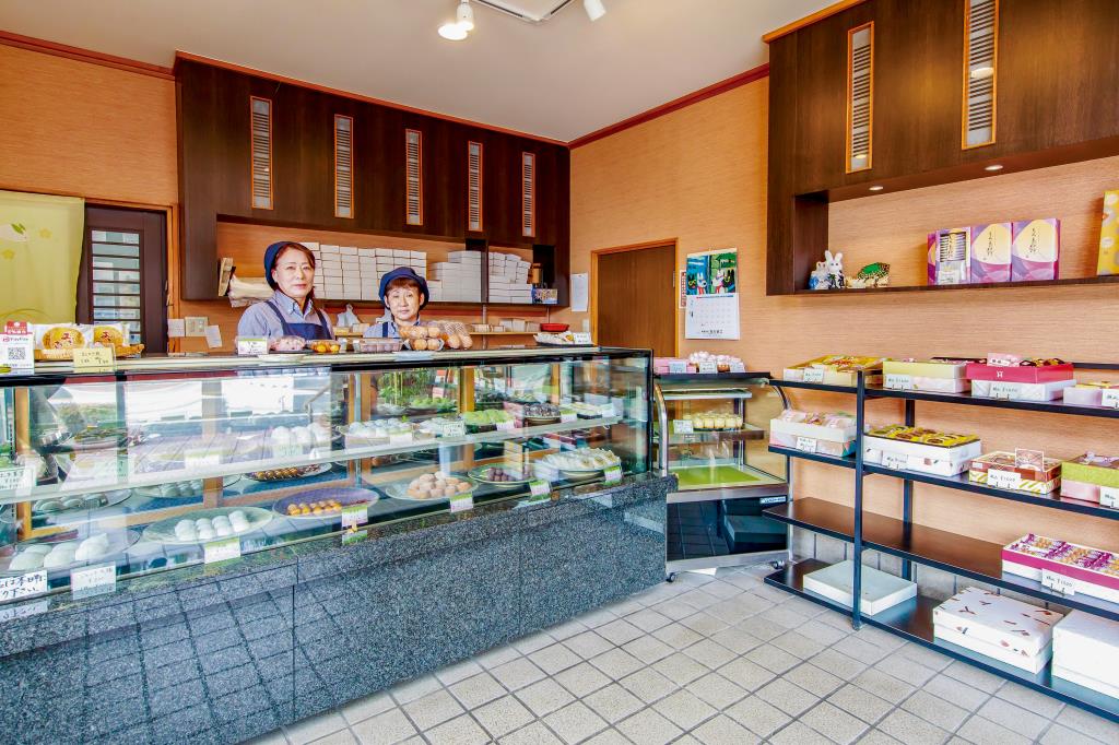 こだわりにの和三盆のたまごプリン他、草餅、2色団子、ジャンボ大福、季節の苺大福など数十種類もの和菓子がすらりと並ぶ。県内外からの客足が途絶えないほどの人気店だ。