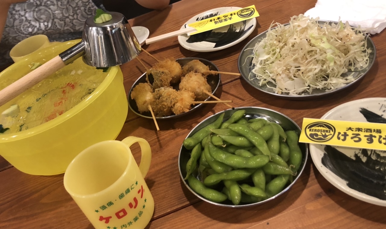・餃子 399円 ・串揚げ各種 80円~ ・炙り牛刺し 790円 ・けろすけ桶酒 1,380円 ※全て税別 |