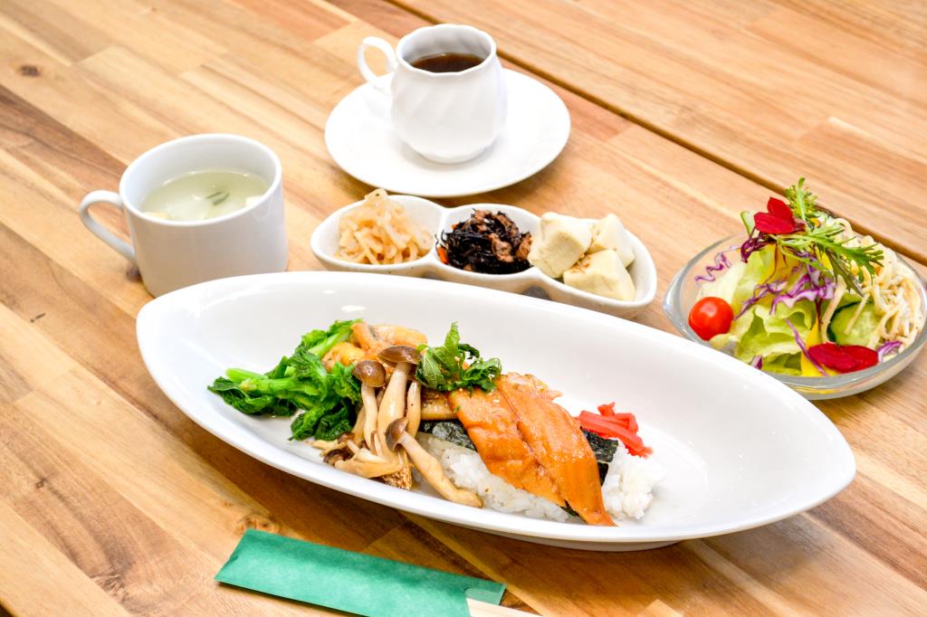 小鉢が多いのも嬉しい。天井の高い明るい店内で食事やカフェタイムを楽しんでみては。