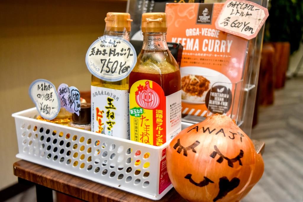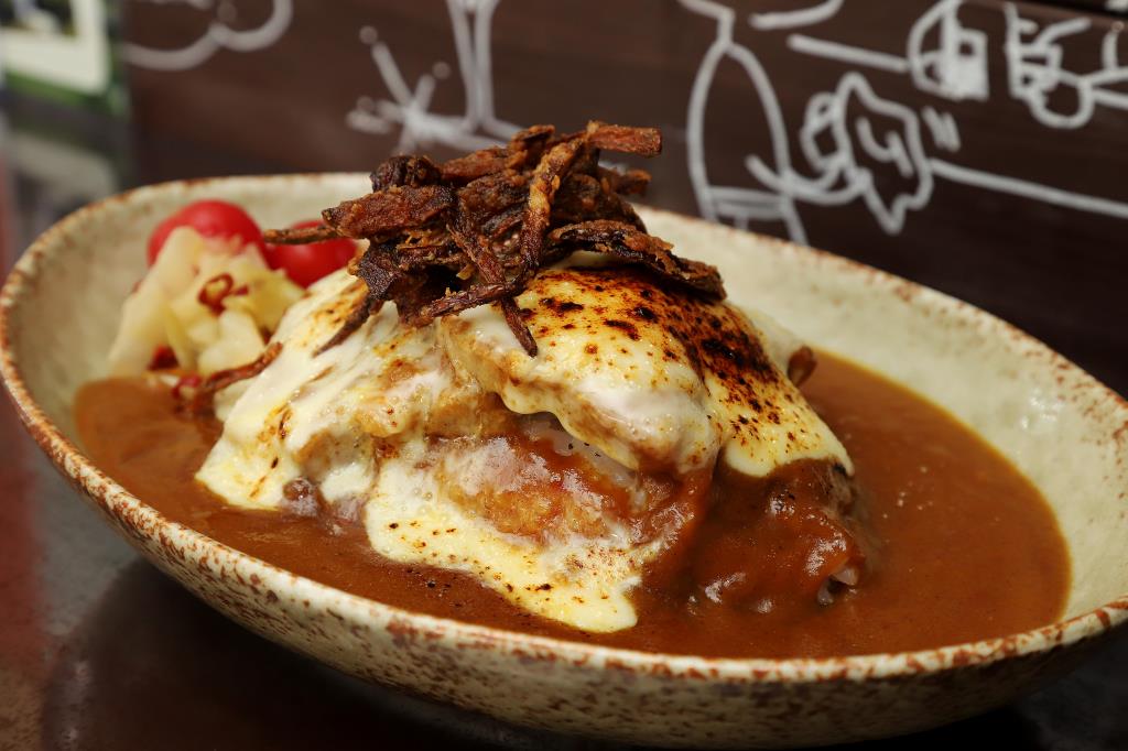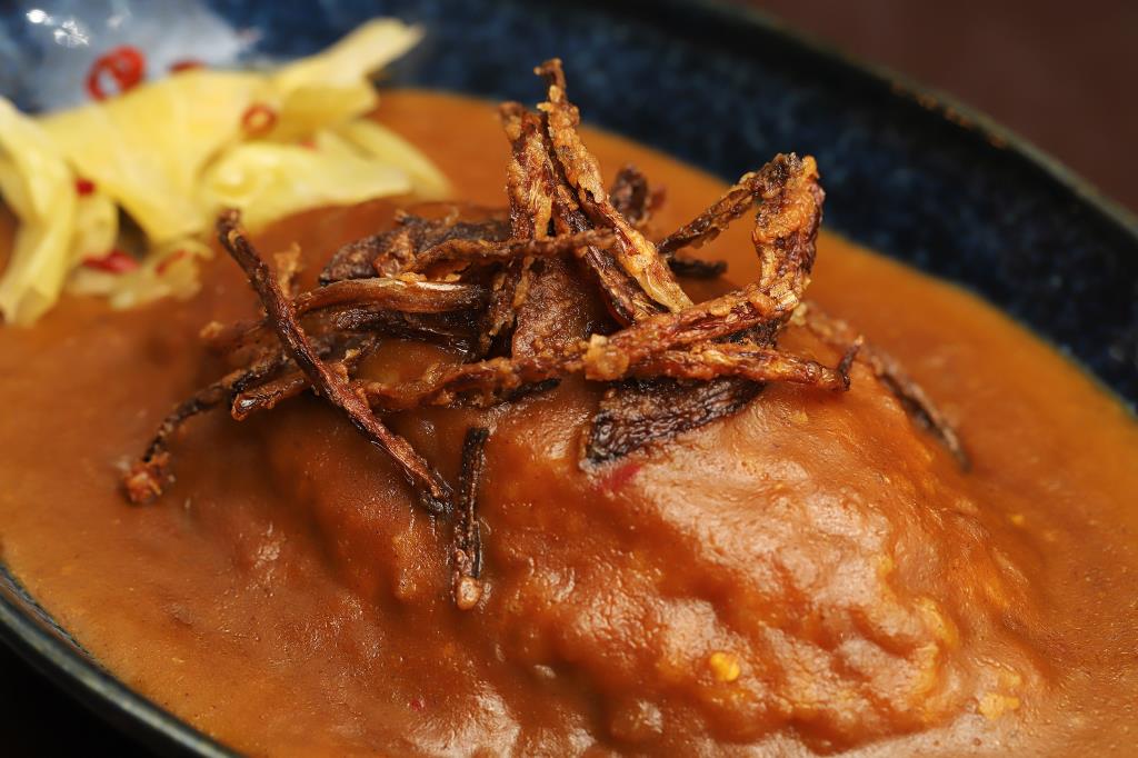 日本一甘いとも言われる淡路島の玉ねぎを一人前に1個使用。その玉ねぎの甘さに加え、鶏ガラスープとデミグラスソースから出るコクと、16種類以上のスパイスから生み出される辛さの3段階の味わいを楽しむことができる。