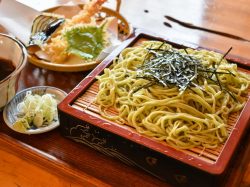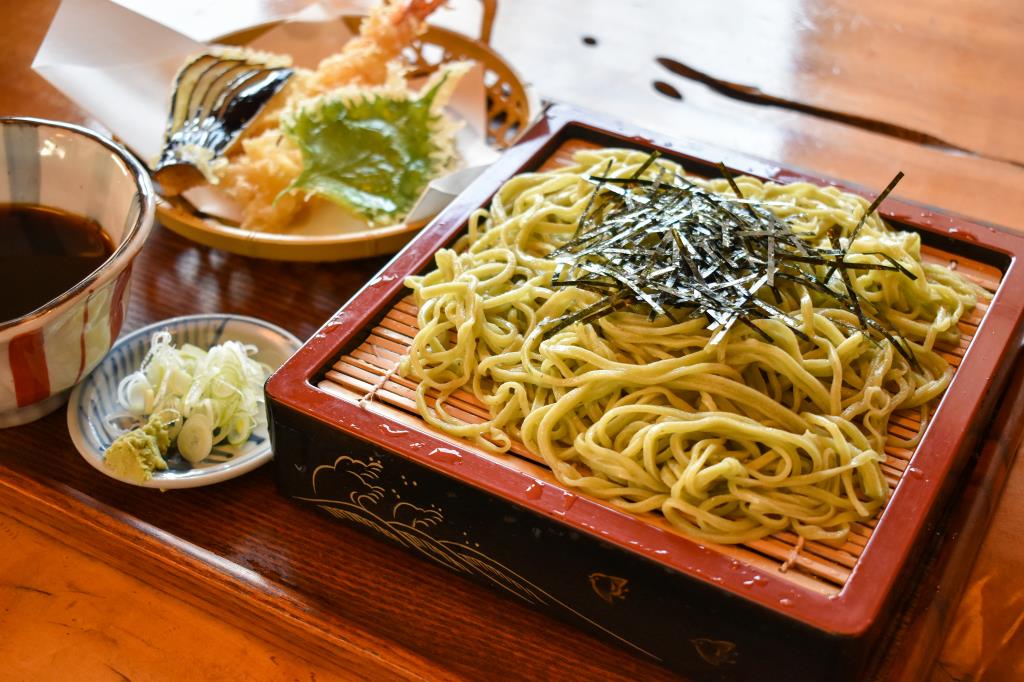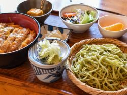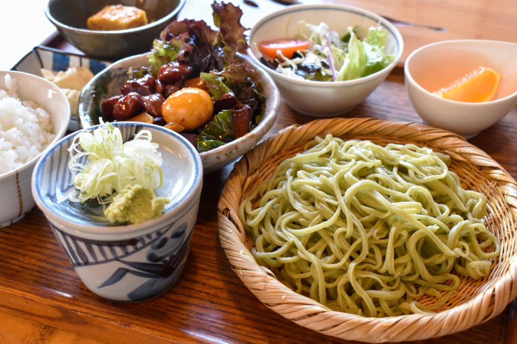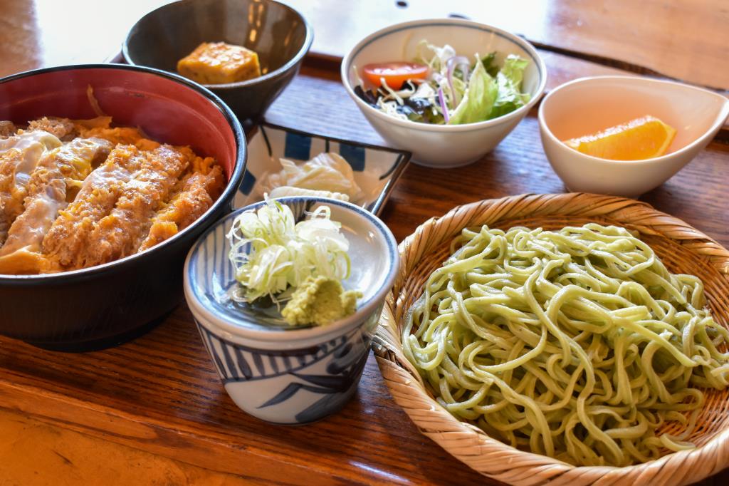 粉の配合により緑がかっているのが特徴の蕎麦と、ハーフサイズの鳥もつ煮を一度に食べることができる「そば定食」はお店1番人気。ボリューム満点で1,000円とリーズナブル!そのほかにもセットメニューがあるのでそちらもオススメ。