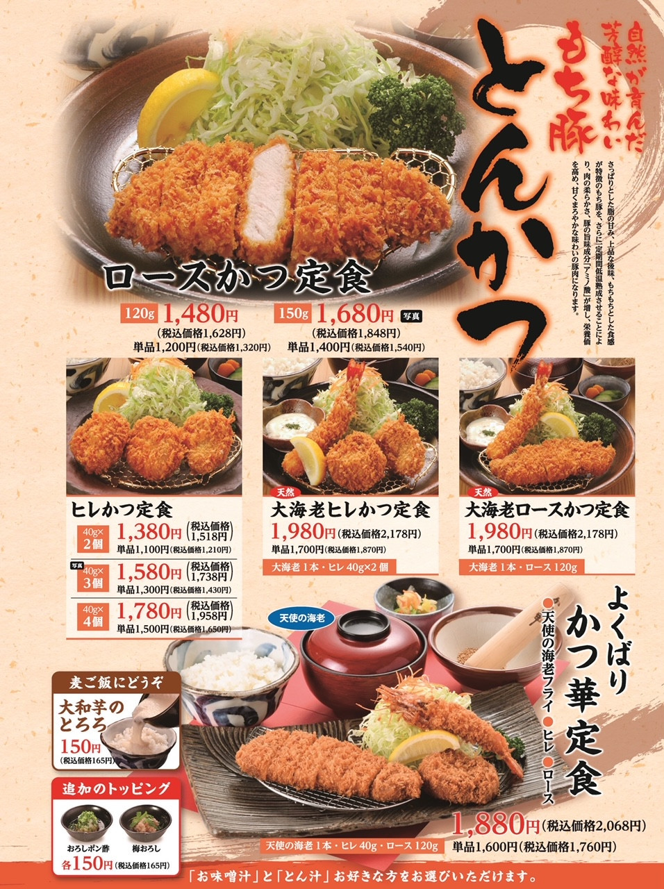 ・ロースかつ定食(120g)1,628円 ・富士桜ポーク厚切りロースかつ定食(170g)2,728円 ・天然大海老 富士桜定食 3,278円 ・レディース御膳 1,848円 ・極上ロースかつ定食 2,728円 ・ジャンボ海老ロース定食 2,728円 |