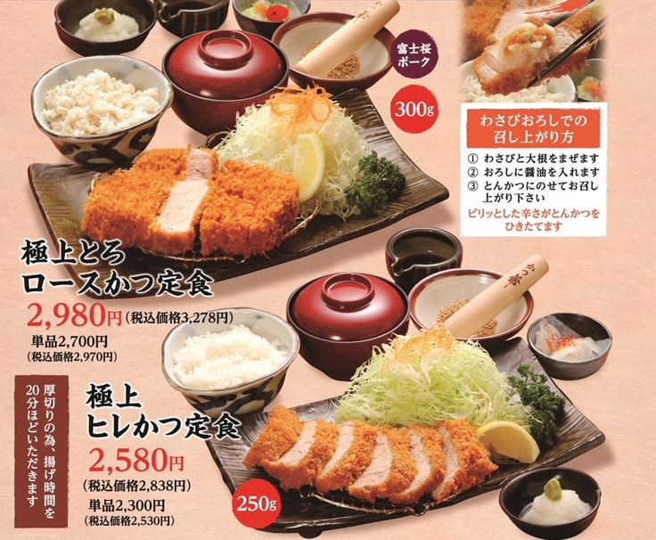 250gの大満足ヒレかつ定食! ソースでもわさびでも美味しくいただけます。 わさびおろしでの召し上がり方 ①わさびと大根を混ぜます。 ②おろしに醤油を入れます。 ③とんかつにのせてお...