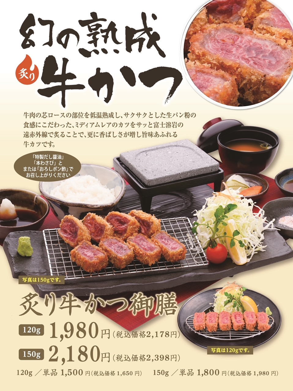 低温熟成し、サクサクとした生パン粉の食感にこだわったミディアムレアのカツをサッと富士熔岩の遠赤外線であぶる事で、更に香ばしさが増し旨味溢れる牛カツです。 「特製だし醤油」「本わさび」または「おろ... -