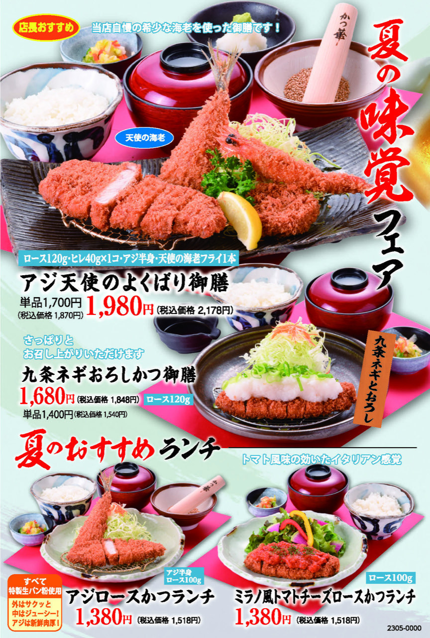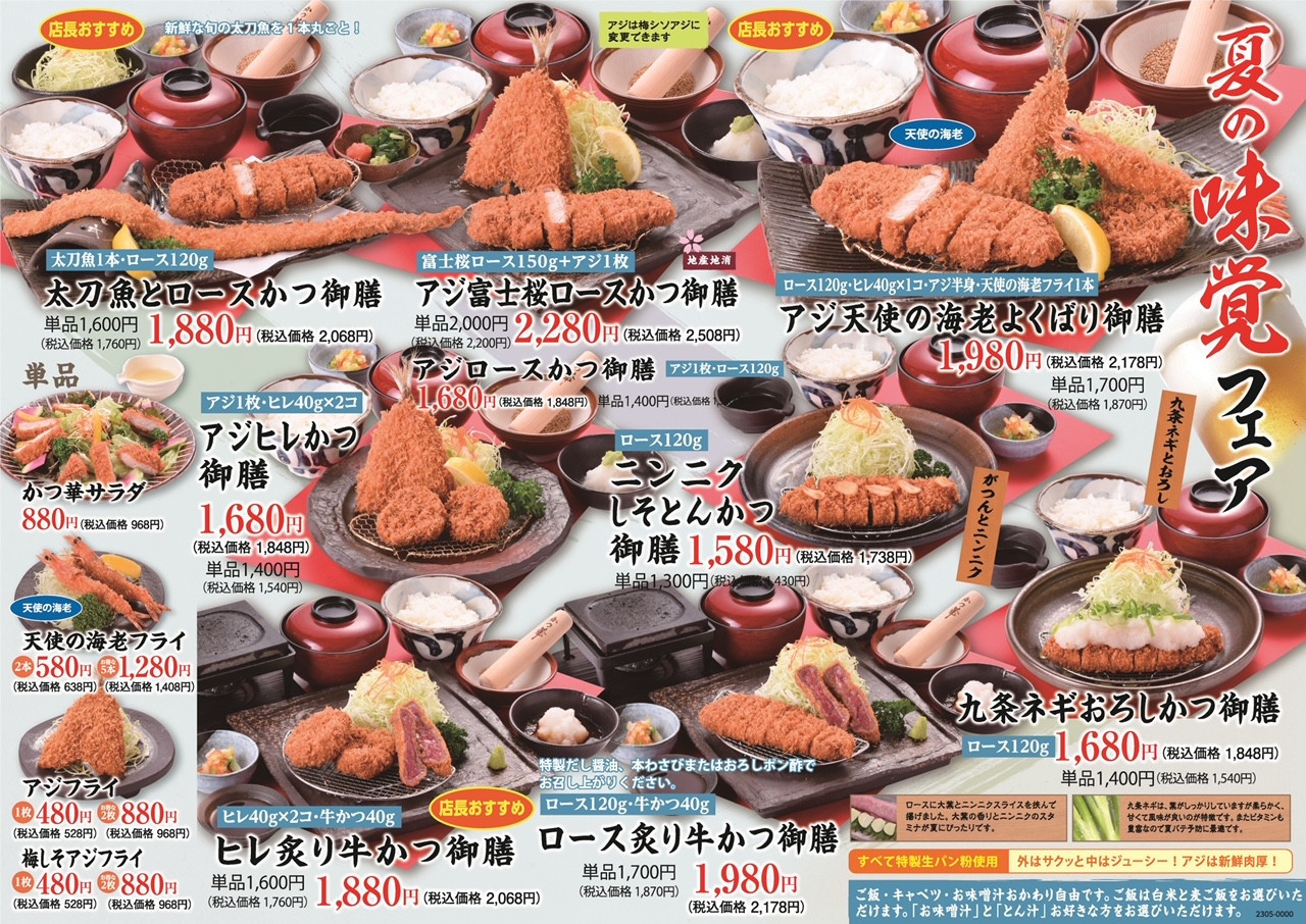・ロースかつ定食(120g)1,628円 ・富士桜ポーク厚切りロースかつ定食(170g)2,728円 ・天然大海老 富士桜定食 3,278円 ・レディース御膳 1,848円 ・極上ロースかつ定食 2,728円 ・ジャンボ海老ロース定食 2,728円 |