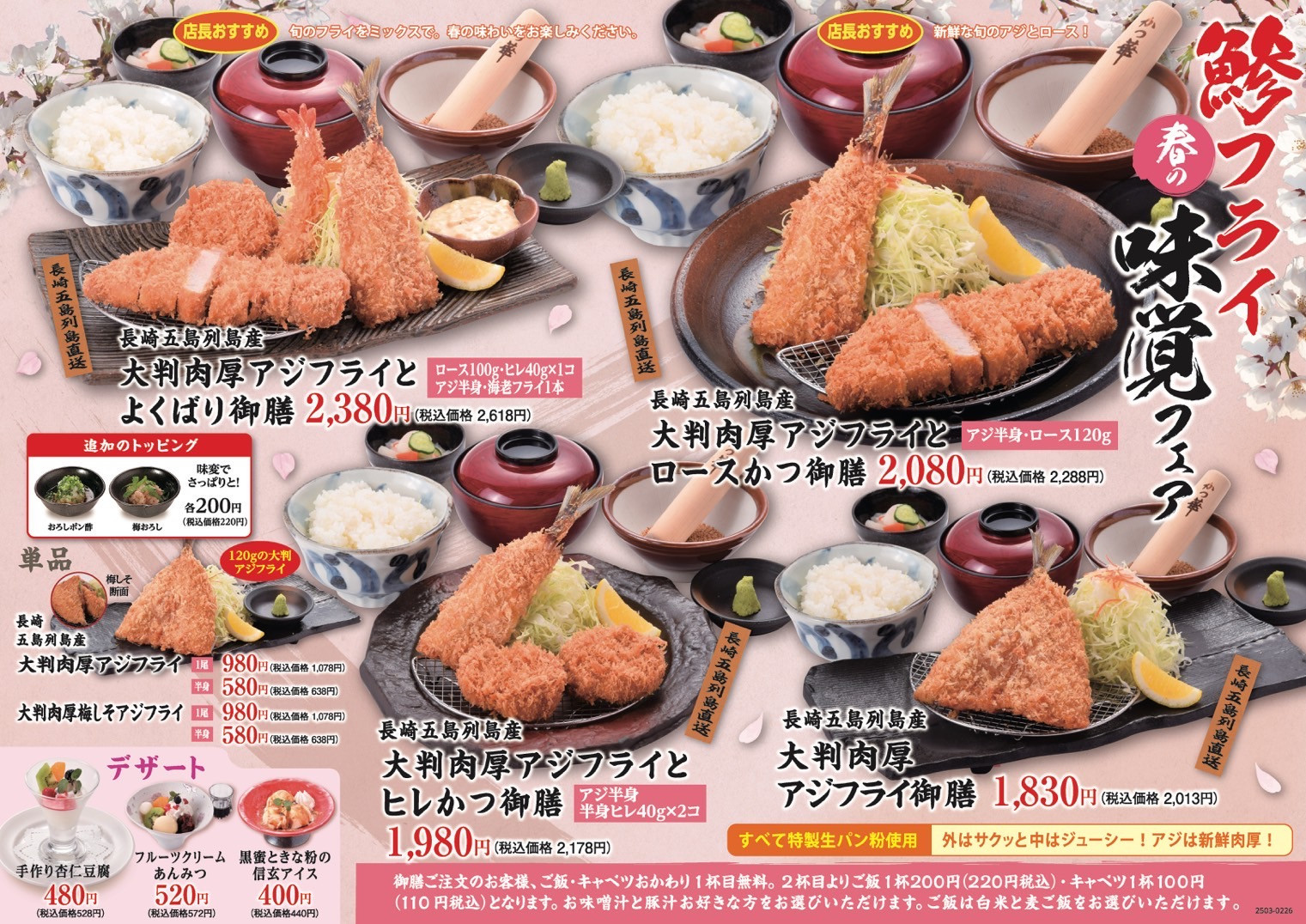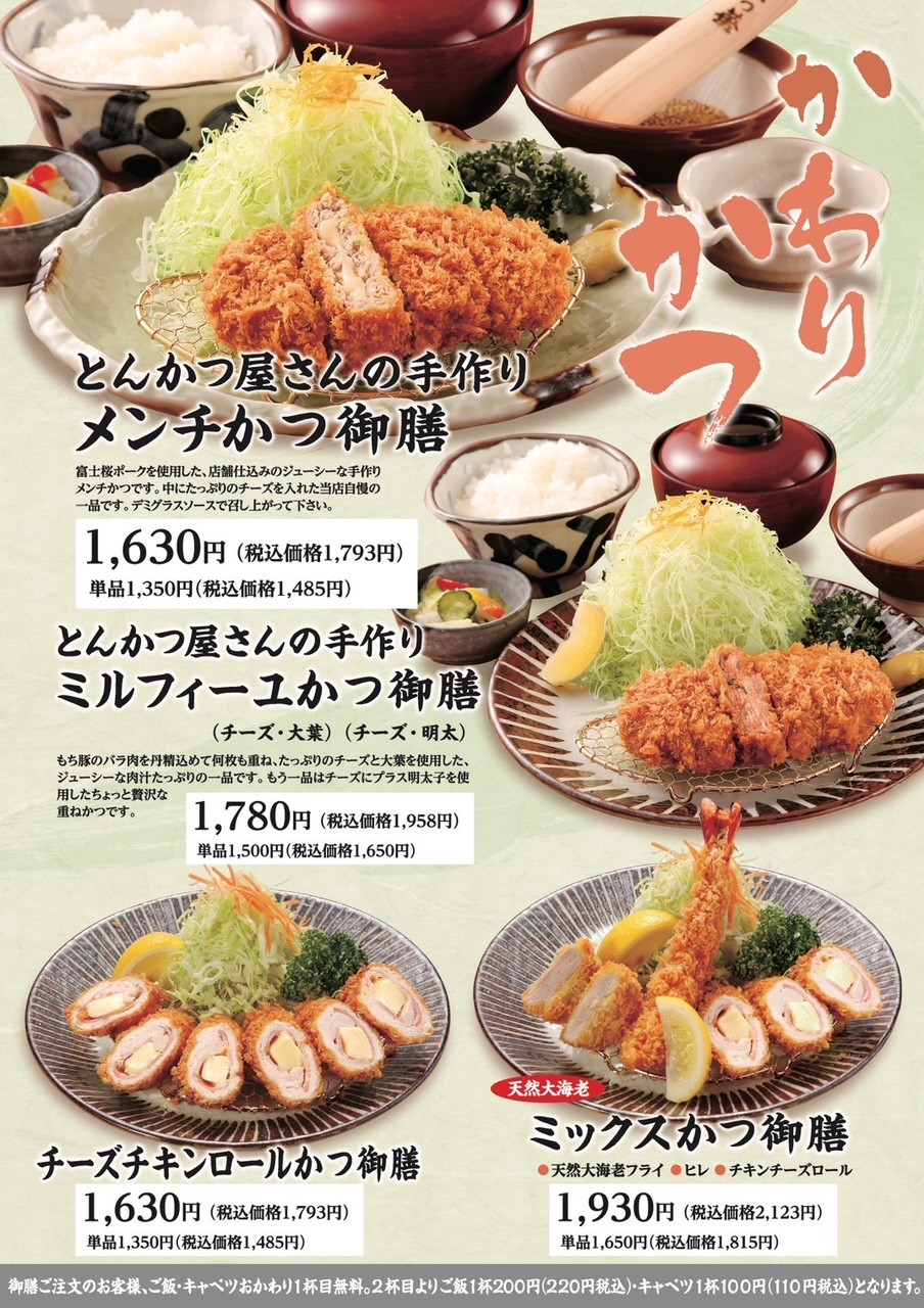 ・ロースかつ定食(120g)1,628円 ・富士桜ポーク厚切りロースかつ定食(170g)2,728円 ・天然大海老 富士桜定食 3,278円 ・レディース御膳 1,848円 ・極上ロースかつ定食 2,728円 ・ジャンボ海老ロース定食 2,728円 |